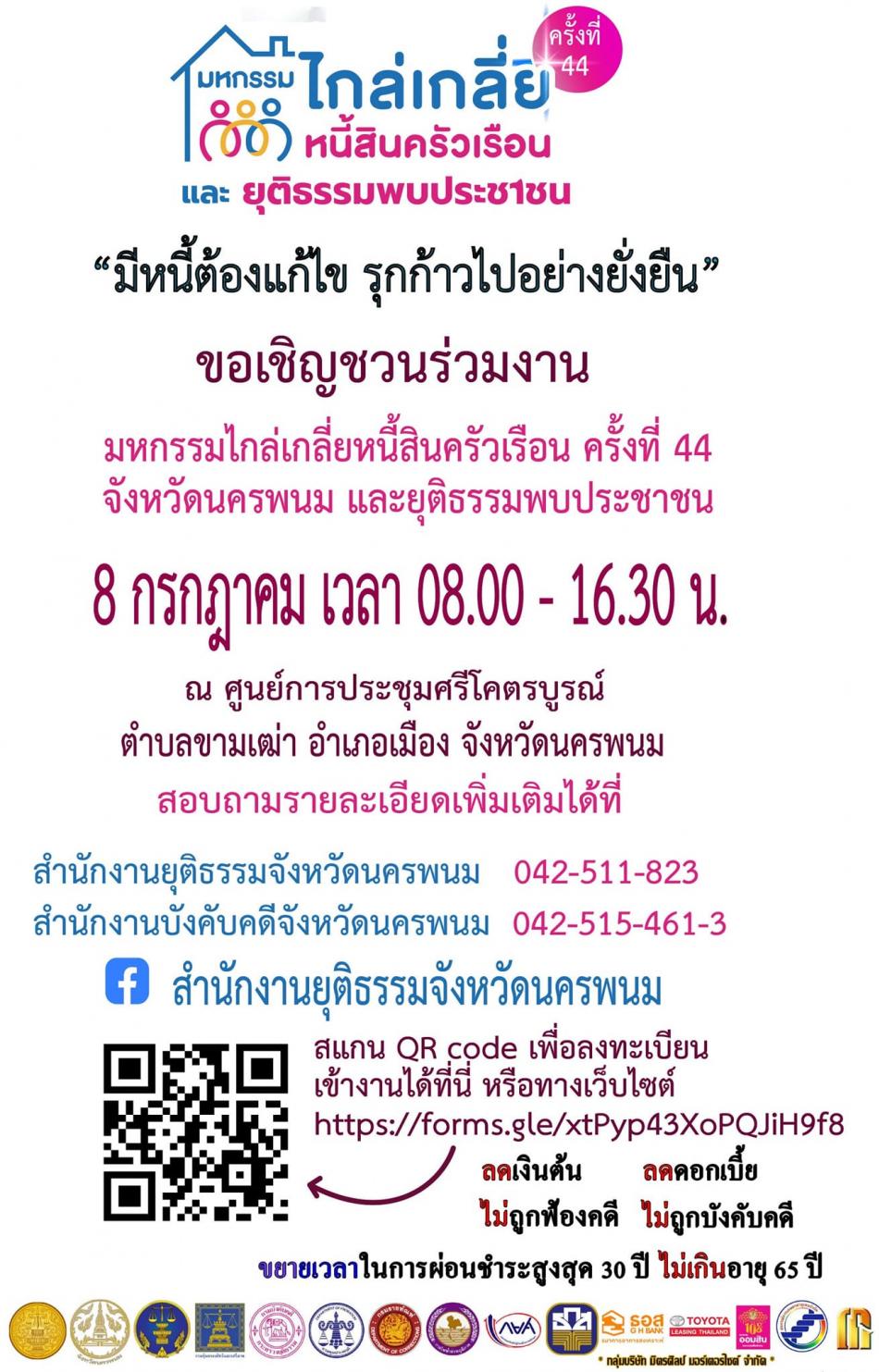 ขอเชิญชวนพ่อแม่พี่น้องและลูกหลานเมืองนครพนม ที่มีหนี้สินครัวเรือน หนี้สถาบันการเงิน และหนี้อื่นๆ ร่วมในงานมหกรรมไกล่เกลี่ยหนี้สินครัวเรือน และยุติธรรมพบประชาชน ครั้งที่ 44 ในวันที่ 8 กรกฎาคม 2565 ณ... [1 กรกฎาคม 2565]