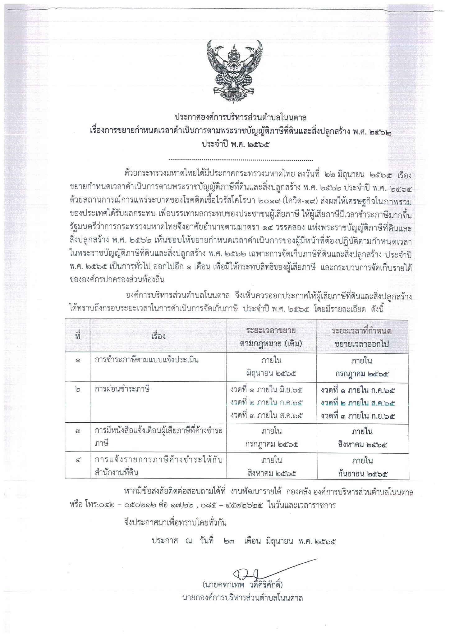 ประกาศองค์การบริหารส่วนตำบลโนนตาล เรื่องการขยายกำหนดเวลาดำเนินการตามพระราชบัญญัติภาษีที่ดินและ สิ่งปลูกสร้างพ.ศ 2562 ประจำปี พ.ศ 2565