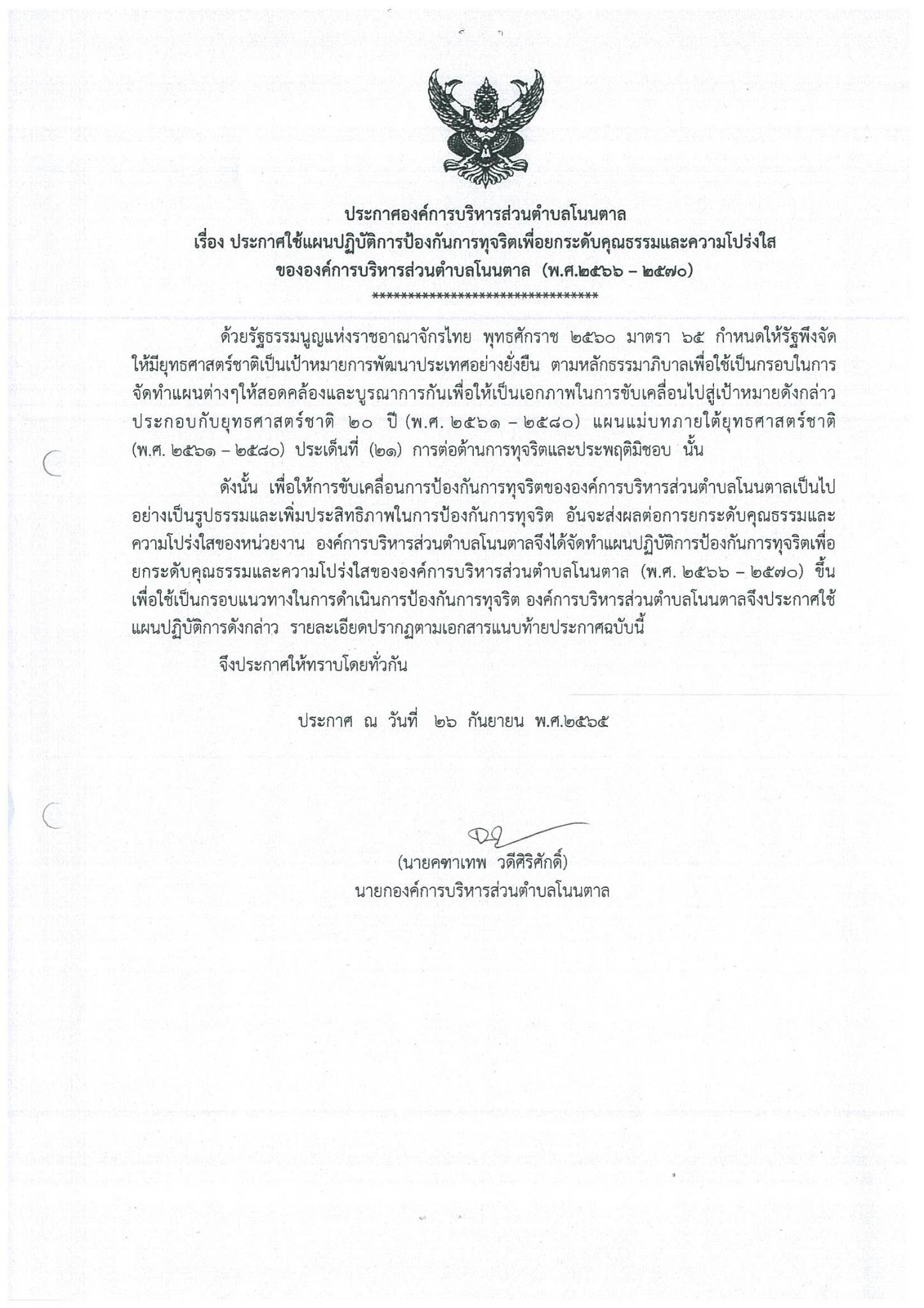 ชื่อเรื่อง : ประกาศใช้แผนปฏิบัติการป้องกันการทุจริตเพื่อยกระดับคุณธรรมและความโปร่งใส องค์การบริหารส่วนตำบลโนนตาล (พ.ศ.2566-2570)