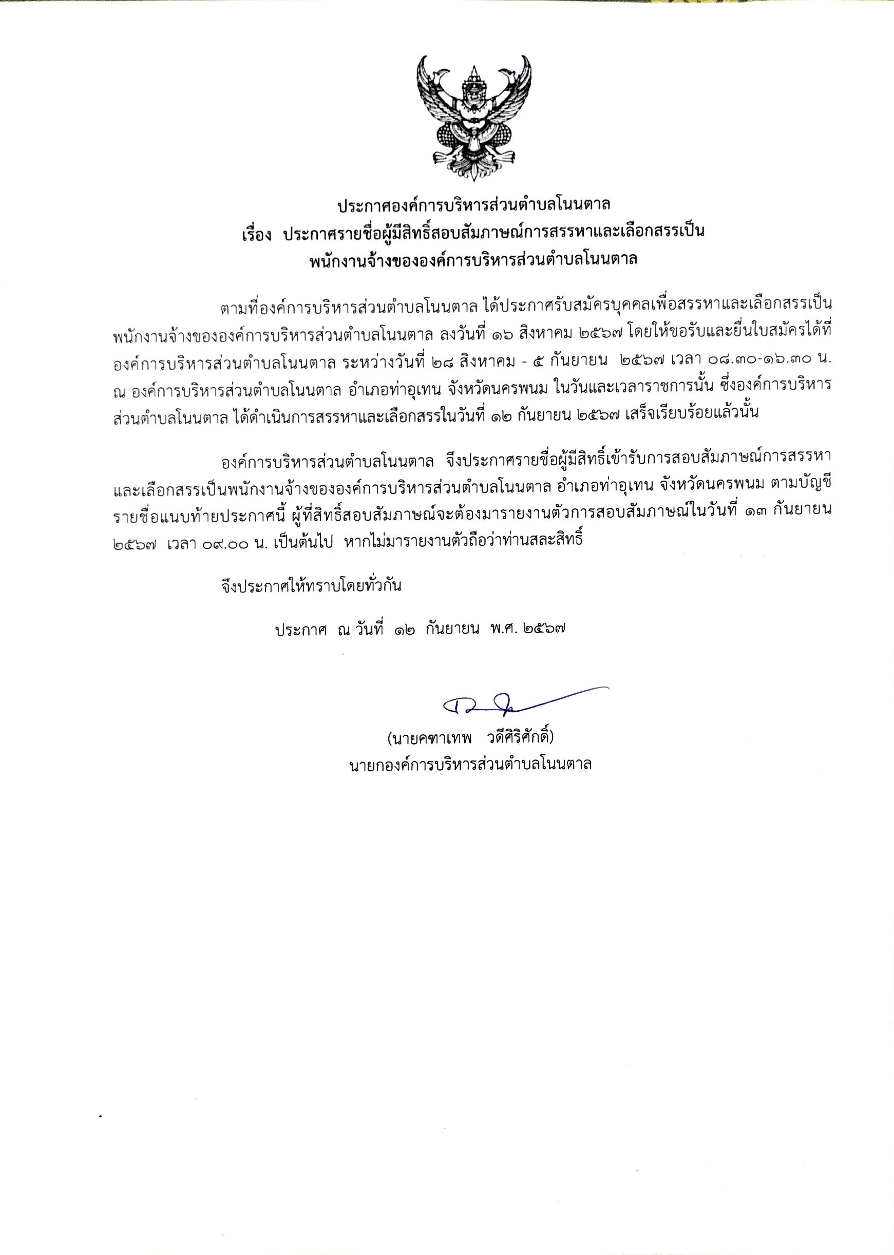 #ประกาศรายชื่อผู้มีสิทธิ์สอบสัมภาษณ์ในการเลือกสรรและเลือกสรรเป็นพนักงานจ้าง ขององค์การบริหารส่วนตำบลโนนตาล สำหรับผู้ที่มีรายชื่อสอบสัมภาษณ์ ให้ท่านเข้าสอบสัมภาษณ์ในวันที่ 13 กันยายน 2567 เวลา 9:00 น เป็นต้นไปหากไม่มารายงานตัวถือว่าท่านสละสิทธิ์