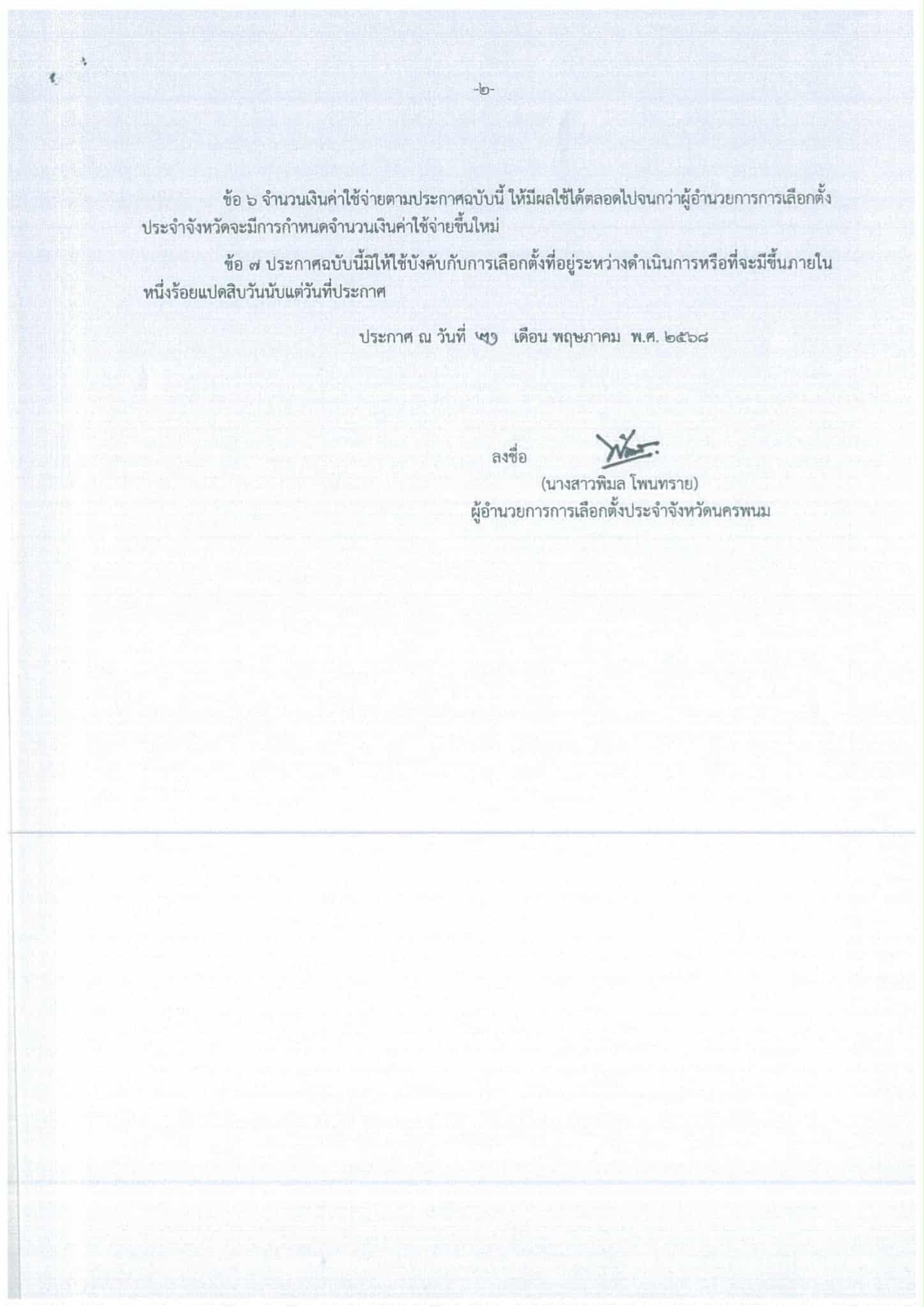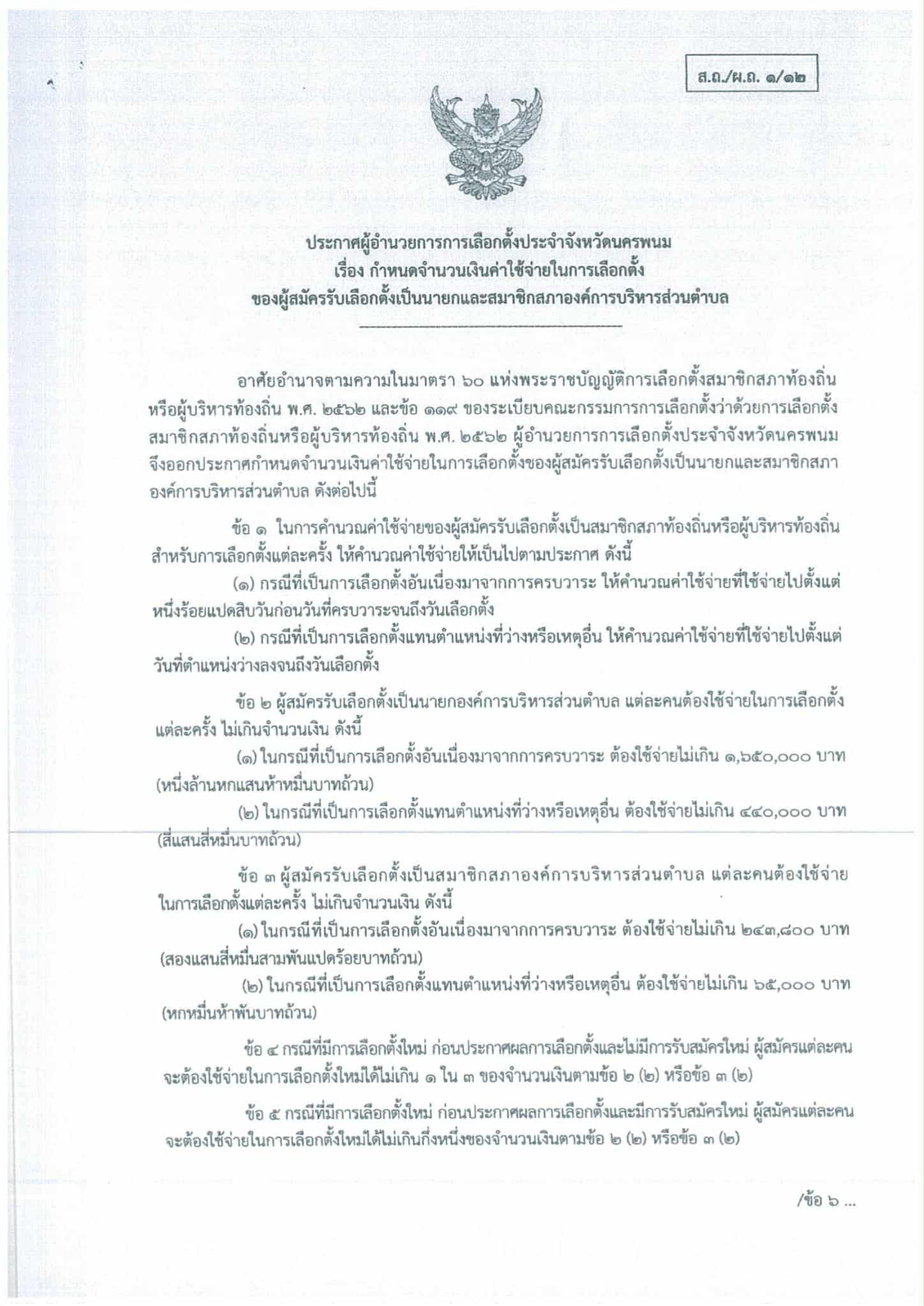ประกาศผู้อำนวยการการเลือกตั้งจังหวัดนครพนม เรื่อง กำหนดจำนวนเงินค่าใช้จ่ายในการเลือกตั้งของผู้สมัครครับเลือกตั้งเป็นนายกและสมาชิกสภาองค์การบริหารส่วนตำบล