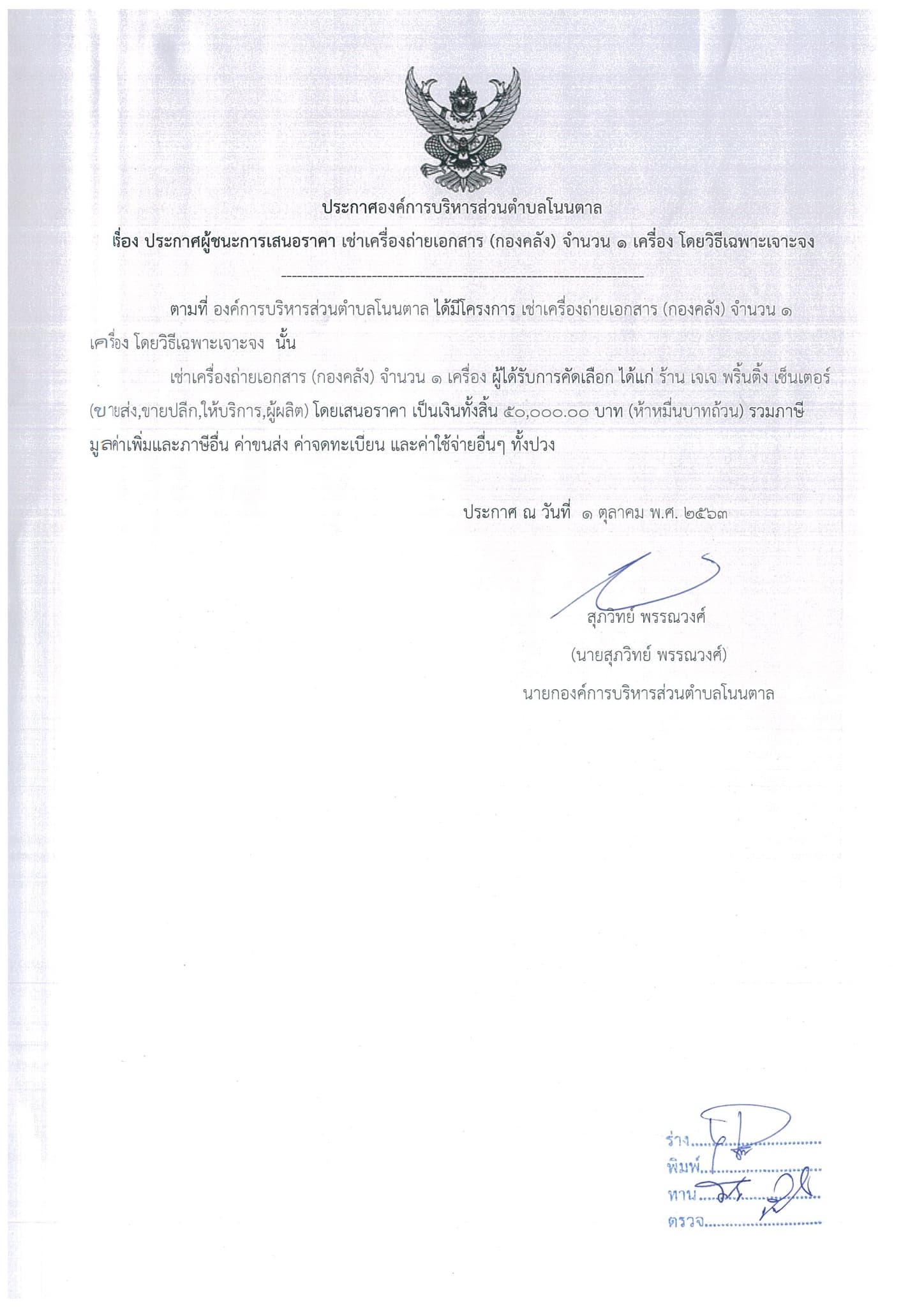 ประกาศผู้ชนะการเสนอราคา เช่าเครื่องถ่ายเอกสาร (กองคลัง) จำนวน 1 เครื่อง โดยวิธีเฉพาะเจาะจง