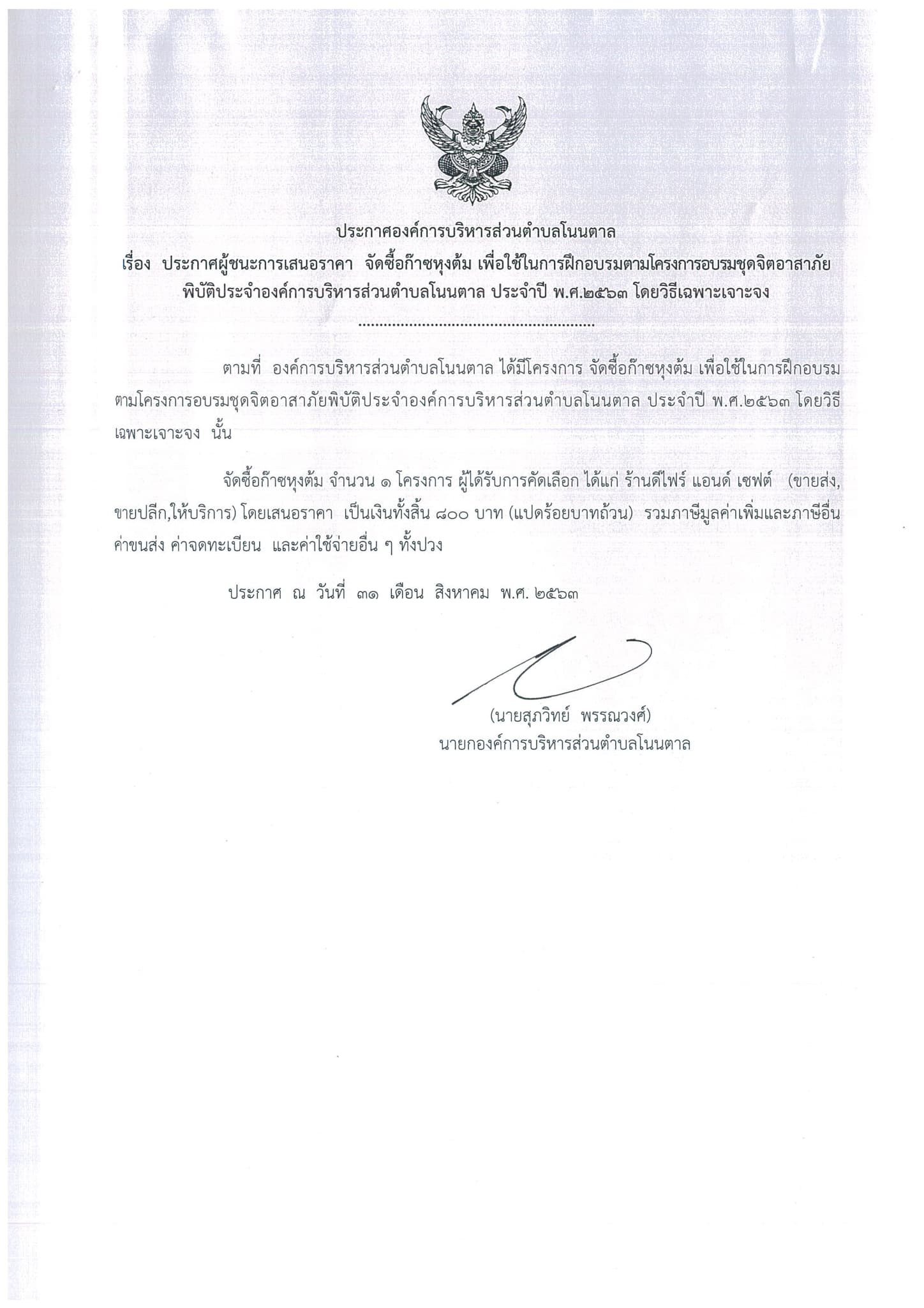 ประกาศผู้ชนะการเสนอราคา จัดซื้อก๊าซหุงต้ม เพื่อใช้ในการฝึกอบรมตามโครงการอบรมชุดจิตอาสาภัยพิบัติ ประจำองค์การบริหารส่วนตำบลโนนตาล ประจำปี พ.ศ.2563 โดยวิธีเฉพาะเจาะจง