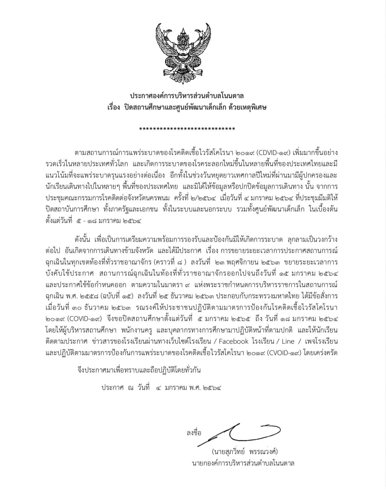ประกาศองค์การบริหารส่วนตำบลโนนตาล เรื่อง ปิดสถานศึกษาและศูนย์พัฒนาเด็กเล็ก สังกัด องค์การบริหารส่วนตำบลโนนตาล