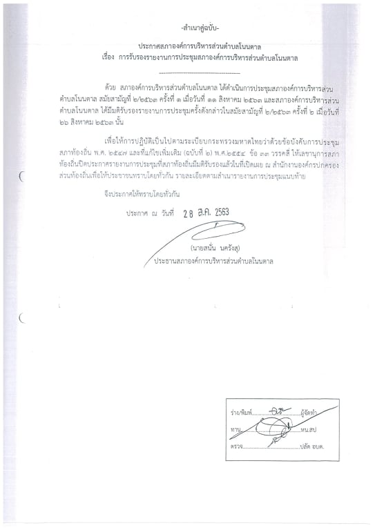 การรับรองรายงานการประชุมสภาองค์การบริหารส่วนตำบลโนนตาล สมัยสามัญที่ 2/ 2563 ครั้งที่ 1