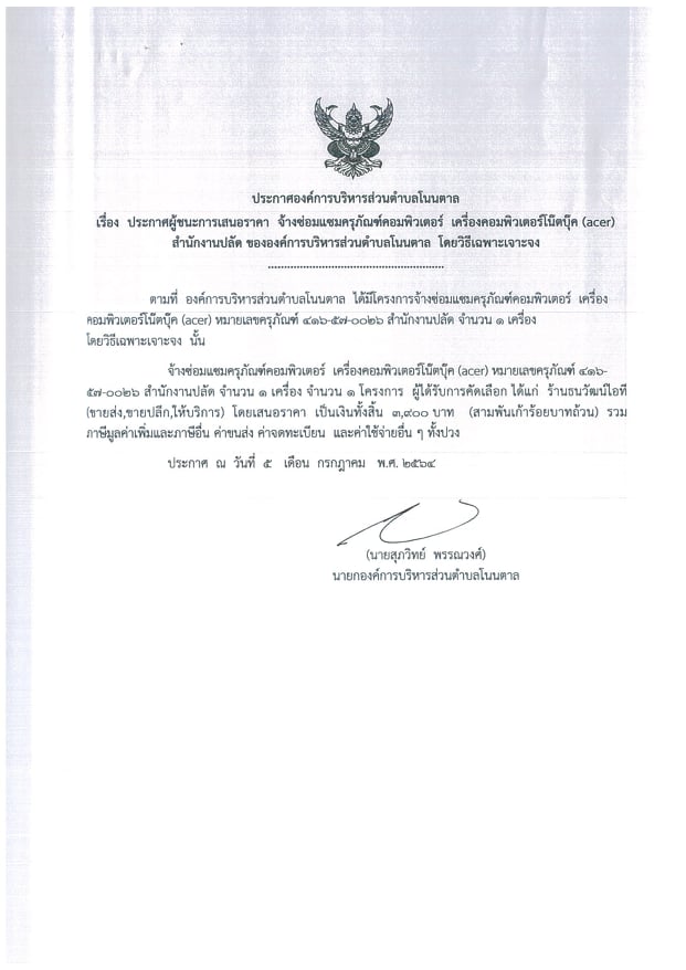 ประกาศผู้ชนะเสนอราคา จ้างซ่อมแซมบำรุงรถยนต์ หมายเลขทะเบียน กง 1416 นครพนม หมายเลขครุภัณฑ์ 001-57-0003 โดยวิธีเฉพาะเจาะจง