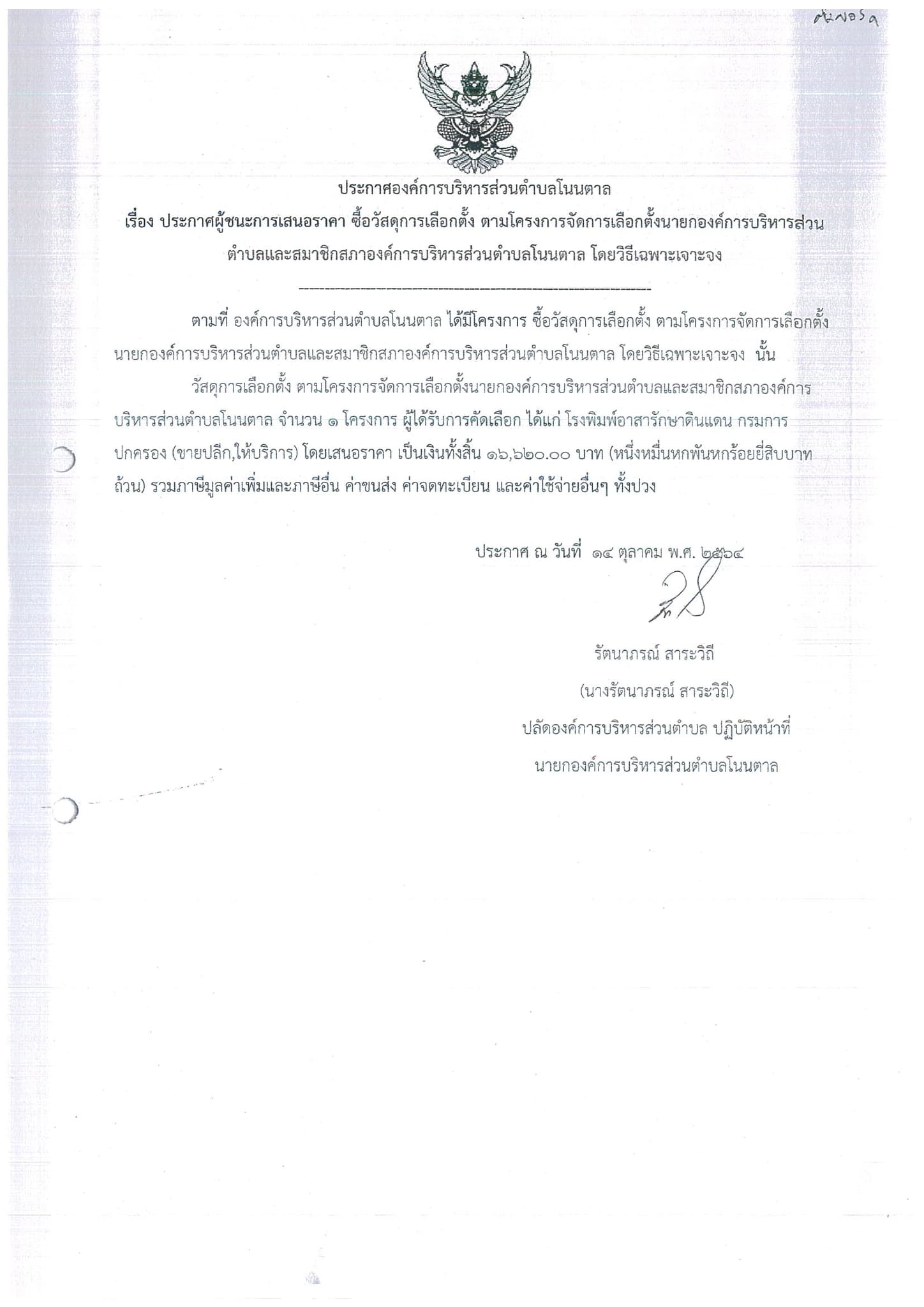 ประกาศผู้ชนะการเสนอราคา ซื้อวัสดุการเลือกตั้ง ตามโครงการจัดการเลือกตั้งนายกองค์การบริหารส่วนตำบลและสมาชิกสภาองค์การบริหารส่วนตำบลโนนตาล โดยวิธีเฉพาะเจาะจง