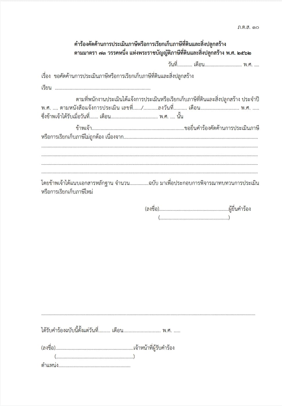 ชื่อเรื่อง : ร้องคัดค้านการประเมินภาษีหรือการเรียกเก็บภาษีที่ดินและสิ่งปลูกสร้าง (ภ.ด.ส. 10)