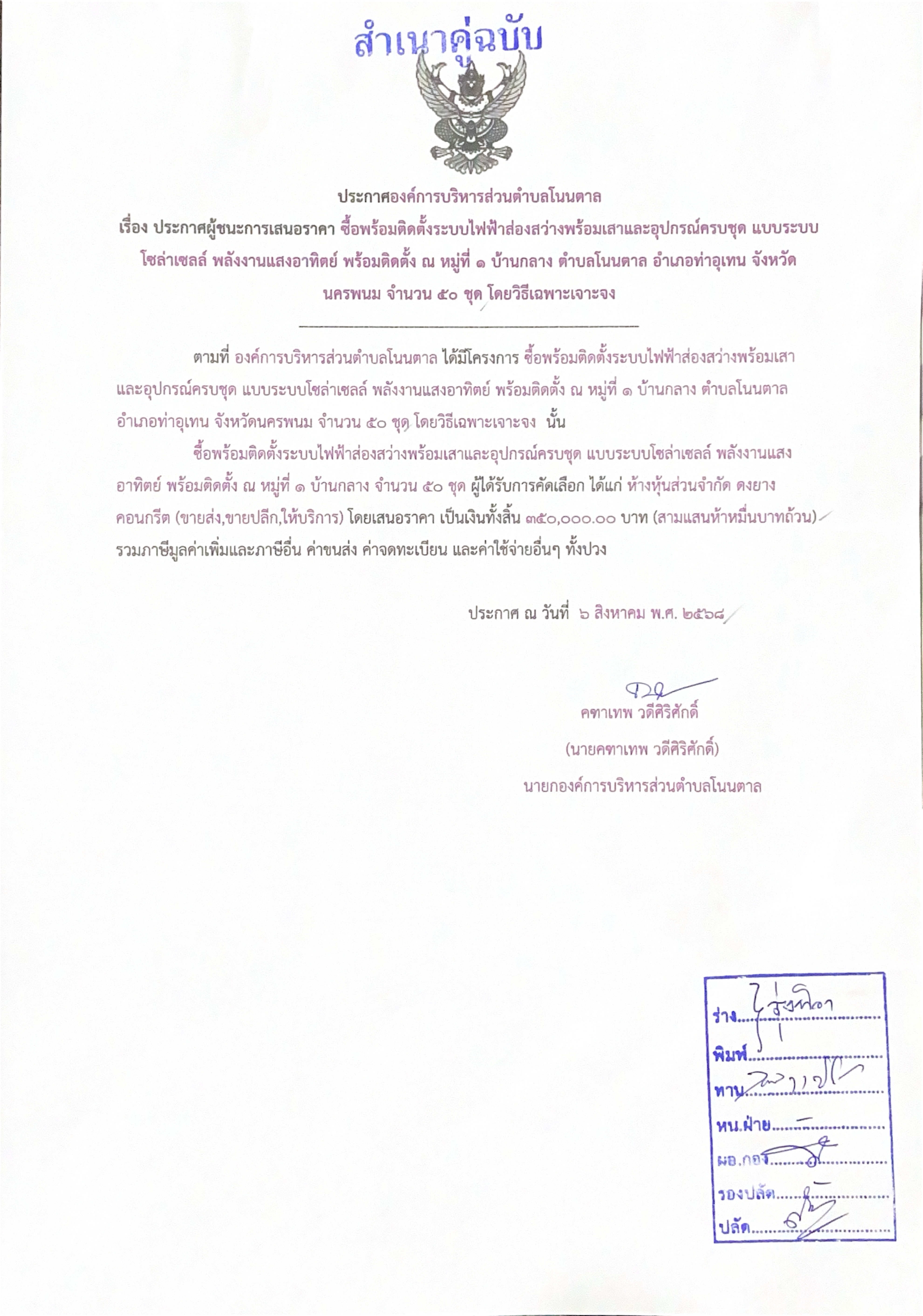 ชื่อเรื่อง : ประกาศผู้ชนะเสนอราคา ซื้อพร้อมติดตั้งระบบไฟฟ้าส่องสว่างพร้อมเสาและอุปกรณ์ครบชุด แบบระบบโซล่าเซลล์ พลังงานแสงอาทิตย์ พร้อมติดตั้ง ณ หมู่ที่ 1 บ้านกลาง ตำบลโนนตาล อำเภอท่าอุเทน จังหวัดนครพนม จำนวน 50 ชุด โดยวิธีเฉพาะเจาะจง
