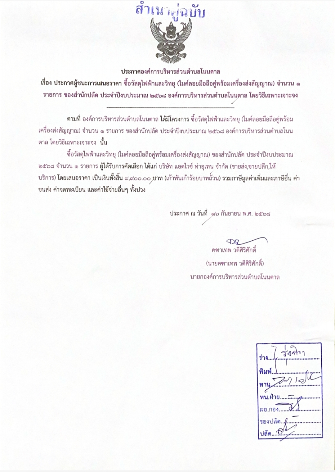ชื่อเรื่อง : ประกาศผู้ชนะเสนอราคา จัดซื้อวัสดุไฟฟ้าและวิทยุ(ไมค์ลอยมือถือคู่พร้อมเครื่องส่งสัญญาณ) จำนวน 1 รายการ ของสำนักปลัด ประจำปีงบประมาณ 2568 องค์การบริหารส่วนตำบลโนนตาล โดยวิธีเฉพาะเจาะจง